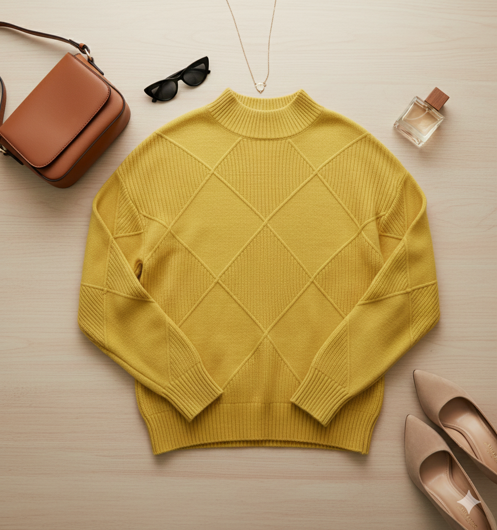 Ein weicher, femininer Strick in einem warmen Gelbton, der jedem Outfit Licht und Frische verleiht. Perfekt für Frauen, die subtile Farbe lieben, ohne auf Eleganz zu verzichten.